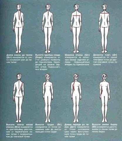 Итак, размер определяют размерные признаки идеальной пропорциональной фигуры. Однако встречаются фигуры, размерные признаки которых сильно отличаются в пропорциях от идеальных (соотношение обхватов: груди - талии - бедер). В таких случаях к процессу конструирования нужно подходить индивидуально и соответственно использовать индивидуальные размерные признаки.
